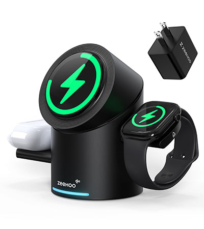 First, check that your device is properly aligned (you should see the blue LED indicator). Make sure your phone case isn't too thick or metallic. If your Apple Watch isn't charging, ensure the band isn't preventing full contact with the puck. For AirPods, verify the case is centered on the left tray. If issues persist, try using the included cable with a different USB-C adapter – some low-power adapters can't handle three devices simultaneously.