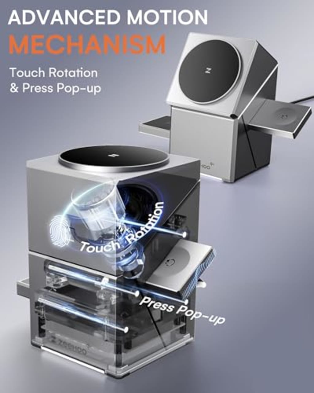 • Qi2-certified 15W fast charging: Magnetic alignment ensures perfect placement every time — no more dead phones from misaligned charging • Simultaneous 3-device charging: Phone, Apple Watch, and AirPods all power up together — no more choosing which device gets the outlet • Auto-rotating phone stand (adjustable tilt): Perfect viewing angle for video calls, streaming, or notifications while charging • Retractable side trays: Watch puck and earbud tray slide out when needed, hide away for travel — genius space-saving design • Compact cube storage mode: Folds into a 2.6" × 2.6" × 4.2" cube that fits in any bag or suitcase